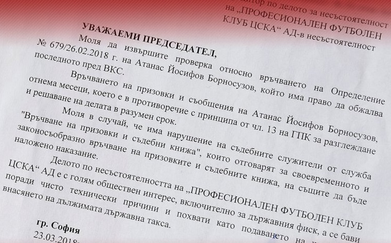 Никола Газдов, член на Управителния съвет на ЦСКА, внесе нова молба в Софийския апелативен съд заради откровената подигравка с българското общество, които ни поднася случаят „Атанас Борносузов“. Вчера (26 март) се навърши точно месец от Определението, което Атанас Борносузов има право да обжалва пред ВКС.
