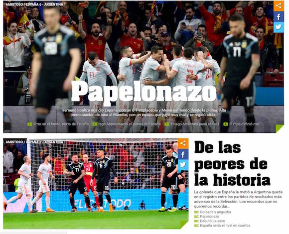 Аржентинската преса не пощади селекцията на Хорхе Сампаоли след снощната унизителна загуба от Испания с 1:6 в контролна среща. Местните, както и чуждестранните медии се обединиха в остри критики за представянето на “гаучосите”, определяйки го като катастрофа и унижение. В двубоя в Мадрид участие не взе Лионел Меси, който се оплаква от контузия.