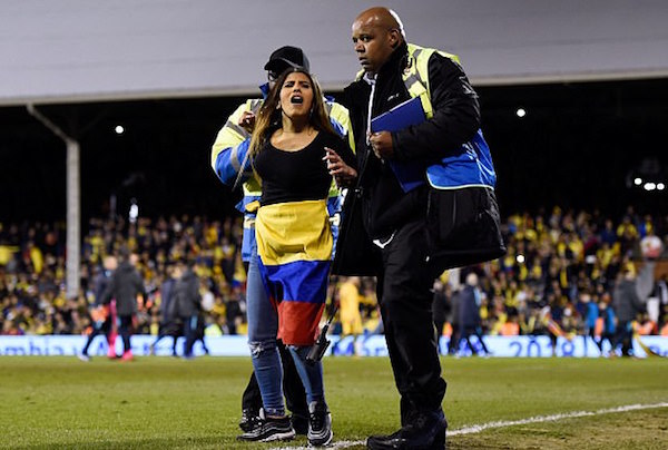 Фенове нахлуха на терена на стадиона на Фулъм “Крейвън Котидж” в Лондон, където преди броени дни се игра приятелската среща между Колумбия и Австралия. Двубоят завърши при резултат 0:0, а екшънът се разигра след последния съдийски сигнал, когато колумбийски фенове щурмуваха игрището в опит да се докоснат до любимците си. В Instagram вече стана хит кратко видео на спринтираща фенка, която се опитва (и успява!) да се добере до Хамес Родригес.