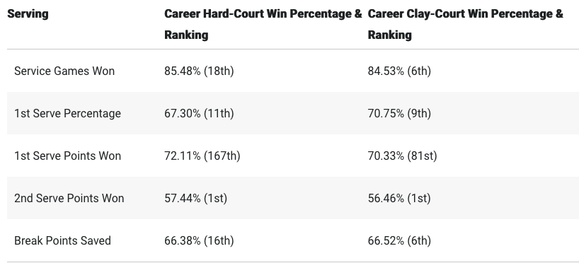 Вижте статистическите показатели на сервиса на Надал на твърди кортове и на клей за цялата му кариера (в скобите са мястото му по този показател спрямо конкуренцията в исторически план):