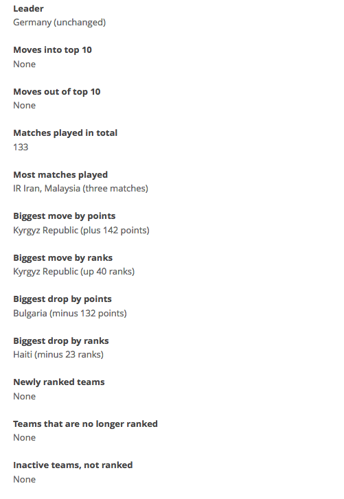 Лидер в подреждането остава световният шампион Германия. Втори са бразилците, докато трети вече е Белгия. Най-голям скок прави тима на Киргизстан - 40 места. В ранглистата на ФИФА се отчитат с различна тежест резултатите на националните отбори в последните 48 месеца.