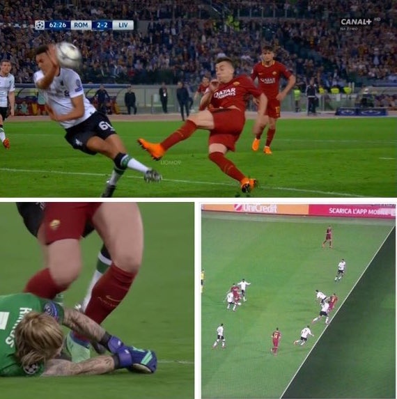 Претенциите на Рома са ясни на всички, а и ситуациите изглеждат доста по-лесни за разчитане (б.ред. не и за Скомина и не неговите помощници). Какви обаче бяха претенции на гостите? Според феновете на Ливърпул тимът е трябвало да получи дузпа в самото начало, когато Садио Мане бе изблъскан в наказателното поле от Костас Манолас, чиито ръце бяха на гърба на сенегалеца. При гола на Един Джеко в 52-рата минута, босненцът е в засада в момента на удара на Ел Шаарауи, който бе избит от Кариус, а Джеко направи добавката за 2:2. Ситуацията е много тънка, но при наличието на ВАР този гол нямало да бъде зачетен, продължават с контрааргументите от "Анфийлд". В 76-ата минута Алесандро Флоренци влиза остро в краката на Мане - нарушение, което според привържениците на мърсисайдци заслужава червен картон. В 88-ата минута топката среща ръката на Раджа Наинголан в наказателното поле. Тук Скомина не отсъжда нищо, но в добавеното време дава доста спорна дузпа за Рома за идентично провинение на Рагнар Клаван.