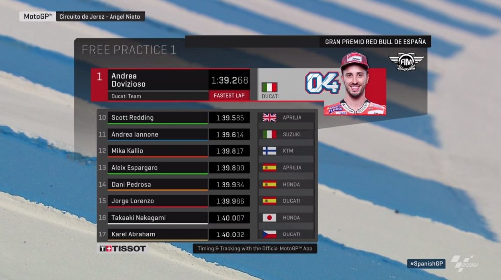 Пилотът на Ducati Андреа Довициозо оглави първата свободна тренировка от MotoGP уикенда в Испания с преднина от едва 0.007 секунди спрямо световния шампион Марк Маркес. Италианецът записа най-добрата обиколка в сесията в нейния край, съумявайки да подобри представянето си в последния сектор на "Херес". Пол Еспаргаро, който поднови през седмицата договора си с КТМ, зае третата позиция в тренировката на само 0.043 секунди зад Дови.