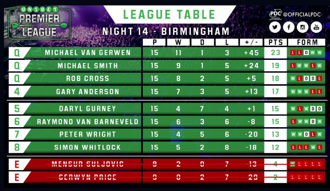 Кръг преди края вече станаха ясни имената на трима от полуфиналистите в Премиър лигата по дартс на PDC (Професионалната дартс корпорация). Това са Майкъл ван Гервен, Майкъл Смит и Роб Крос, които съссигурност ще завършат на първите 3 места в класирането след мачовете от редовния сезон. Ван Гервен дори вече е сигурен победител, тъй като няма как да бъде изместен от първата позиция. В последния кръг в Абърдийн след седмица остава да бъде определен и последният полуфиналист, като за момента 4-ото място се държи от Гари Андерсън, който може да продължи към елиминациите и със загуба, в зависимост от резултатите в останалите мачове.