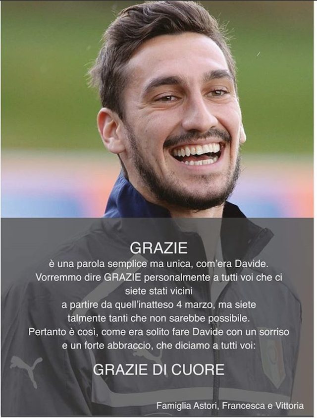 “"Благодаря" е една проста думичка, но и единствена. Такъв беше и Давиде. Бихме искали да благодарим на всички, които бяхте близо до нас от онзи неочакван 4-ти март. Толкова сте много, че не би било възможно. Ще кажем на всички вас, както правеше Давиде - с усмивка и силна прегръдка: Благодарим от сърце”, гласи съобщението, придружено със снимка на Астори.