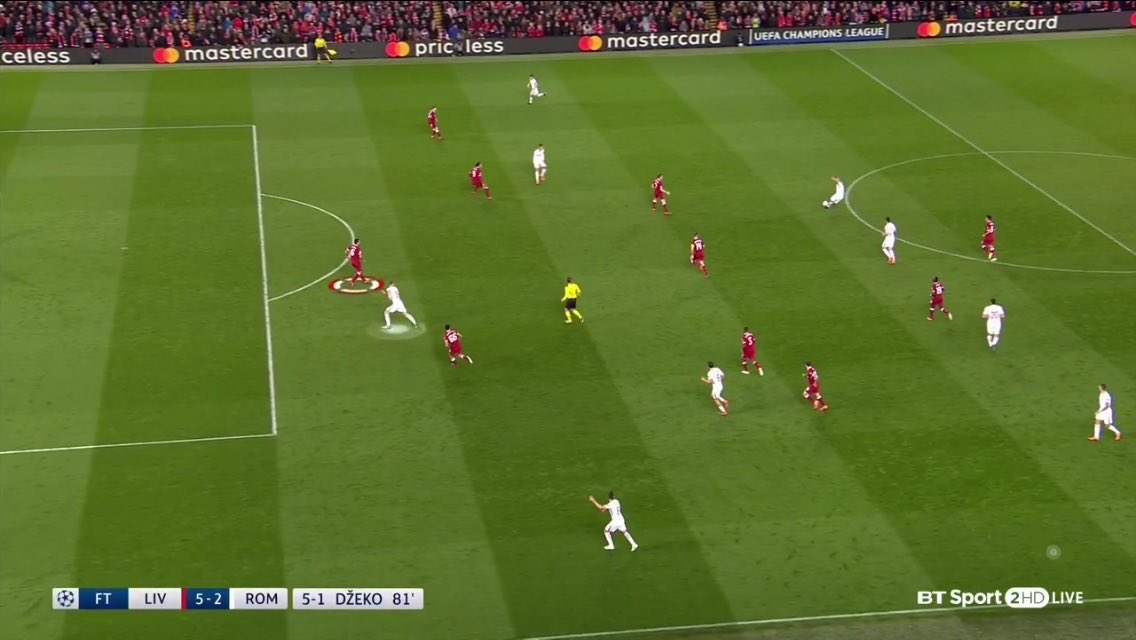 Пространството около първата защитна линия на „вълците” беше толкова голямо, че в продължение на един час Мохамед Салах се превъплъти в Меси. В 61-вата минута Ливърпул вече водеше с 4:0 и Ди Франческо бе принуден да променя всичко издъно. Той просто се върна към корените си: смени централен защитник – Жуан Жезус, за флангови нападател – Диего Пероти, върна назад бековете крила като типични бекове, „отвърза” крилата и постави играчите в добре познатите им роли в пространствата, заемани от 1-4-3-3. Междувременно Ливърпул вкара за 5:0, ала когато Рома отлепи от пистата и полетя, повече не бе надмогваният отбор. В оставащите 110 минути от сблъсъка резултатът бе 6:2 в полза на римляните.