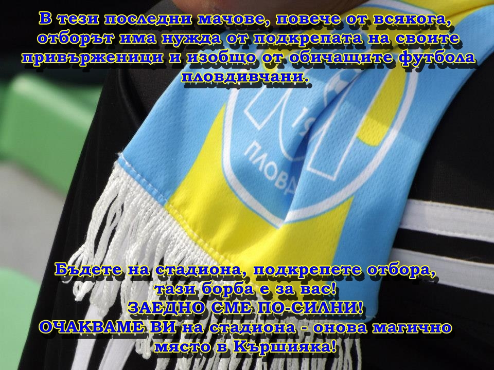 Отборът на Марица посреща тима на Ботев (Гълъбово) в последния си домакински двубой за сезона. Мачът от 29-и кръг на Втора лига е от огромно значение за "пиратите", които са пред угрозата да изпаднат в трета дивизия. Чрез страницата си във "Фейсбук" пловдивчани призоваха: „Последен домакински мач – елате на стадиона и подкрепете тима! И дано заедно успеем!!! Бъдете част от историята!“