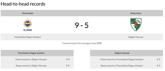 В двете срещи помежду си през редовния сезон двата отбора си размениха по един успех - първо Жалгирис изненада Фенербахче насред Истанбул с 90:80 на 14 декември 2017 година, а след това настоящия шампион стори нещо подобно и спечели в Каунас с 85:78 на 9 март тази година. В рамките на XXI век “фенерите” имат превес срещу този съперник в Евролигата с 9 победи срещу само 5 за литовците.