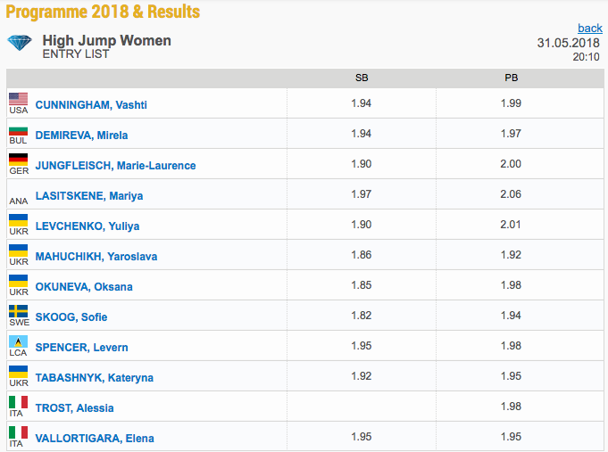 Сребърната световна медалистка от Лондон 2017 Юлия Левченко (Украйна) също ще се появи в сектора. Украинката, който е европейска шампионка до 23 години от 2017-а, има личен рекорд от 2.01 м, постигнат на финала на планетарния форум в Лондон.