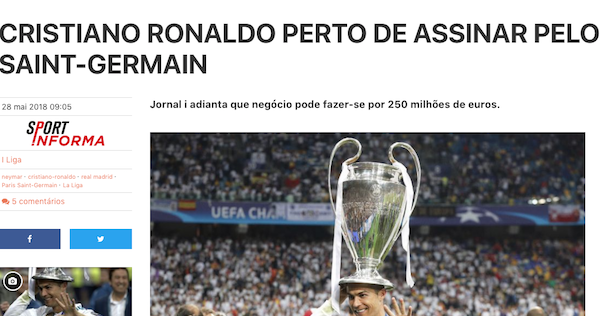 Нападателят на Реал Мадрид Кристиано Роналдо е близо до трансфер в Пари Сен Жермен, съобщи португалското издание на "Сапо". Агентът на 33-годишният играч Жорже Мендеш пристигна в Париж, за да договори преминаването на клиента си във френския клуб.