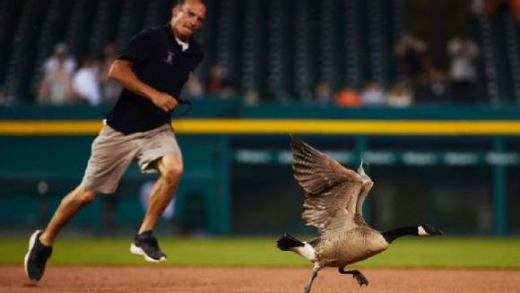 Заблудена дива гъска кацна на бейзболния ст. "Комерика Парк" по време на мача от редовния сезон на МЛБ между Детройт Тайгърс и Лос Анджелис Ейнджълс тази нощ. Необичайната ситуация се разви комично за публиката и болезнено за птицата, но хубавата новина е, че все пак животното е в добро състояние. Освен това гъската бе обявена за кадем на "тигрите", които след дъждовно прекъсване спечелиха домакинството си с 6:1.