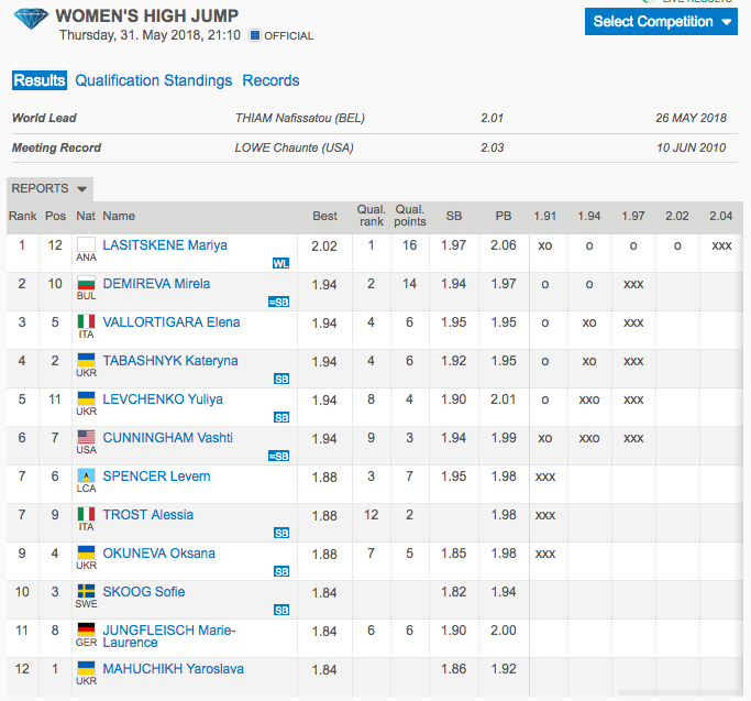 За втори път през сезона Демирева беше победена единствено от световната шампионка Мария Ласицкене, която този път спечели надпреварата с най-добър резултат в света за сезона от 2.02 м. Тя се справи с тази височина от първи опит, след като преди това имаше една грешка на 1.91 м, но премина успешно 1.94 м и 1.97 м. Ласицкене атакува и рекорда на турнира на Шонте Лоу (САЩ) от 2.03 м от 2010 г., след като постави летвата на 2.04 м, но това се оказа непосилна височина за нея тази вечер. Третото място днес зае представителката на домакините Елена Валтортигара с 1.94 м, но скочени от втори опит.