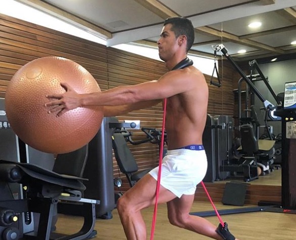 – тук Роналдо работи с някои от най-популярните уреди за спортисти – ластици и швейцарска топка. За постигането на това, което виждате на снимката, са впрегнати куп мускули и мускулчета, за чието съществуване мнозина не подозират.