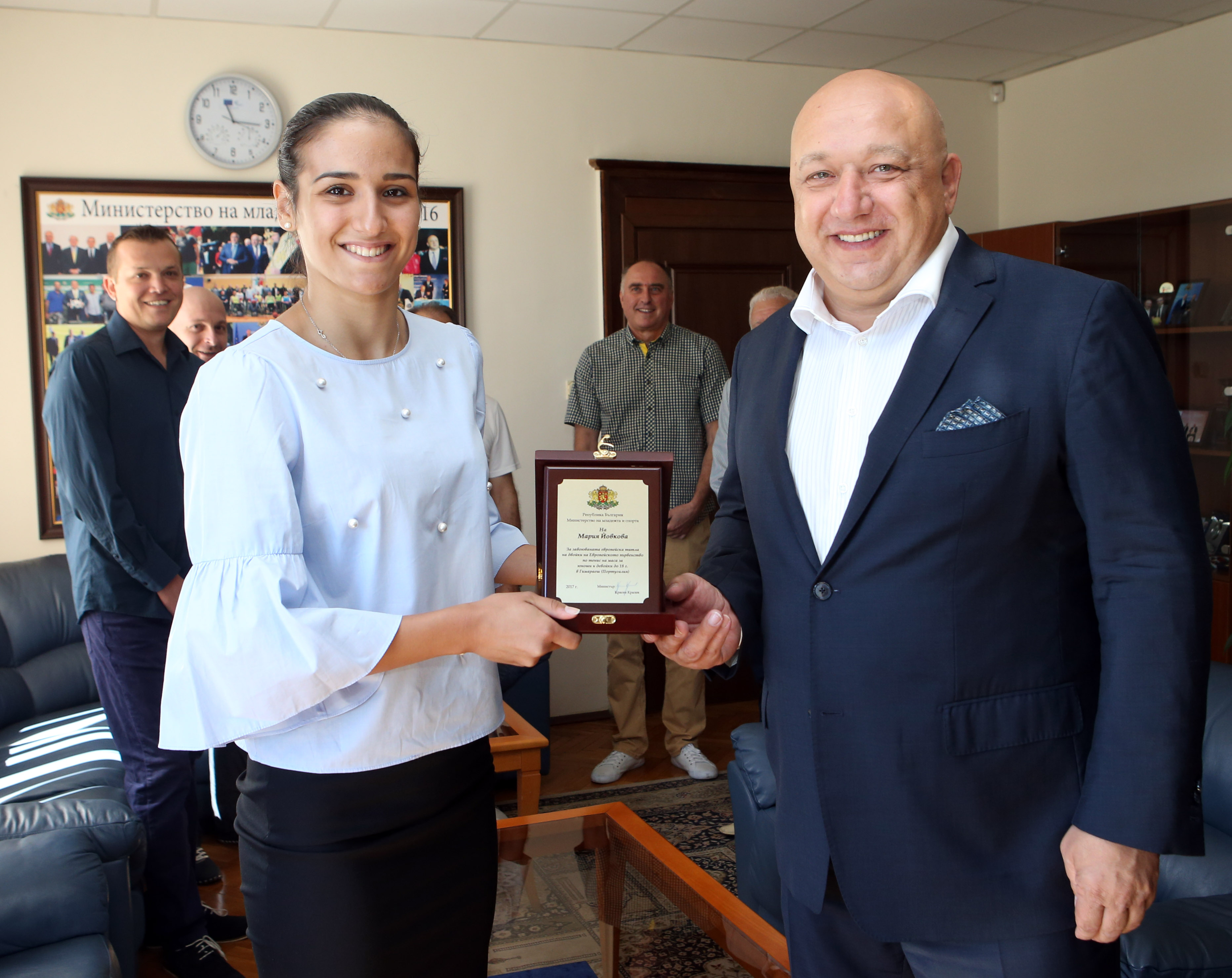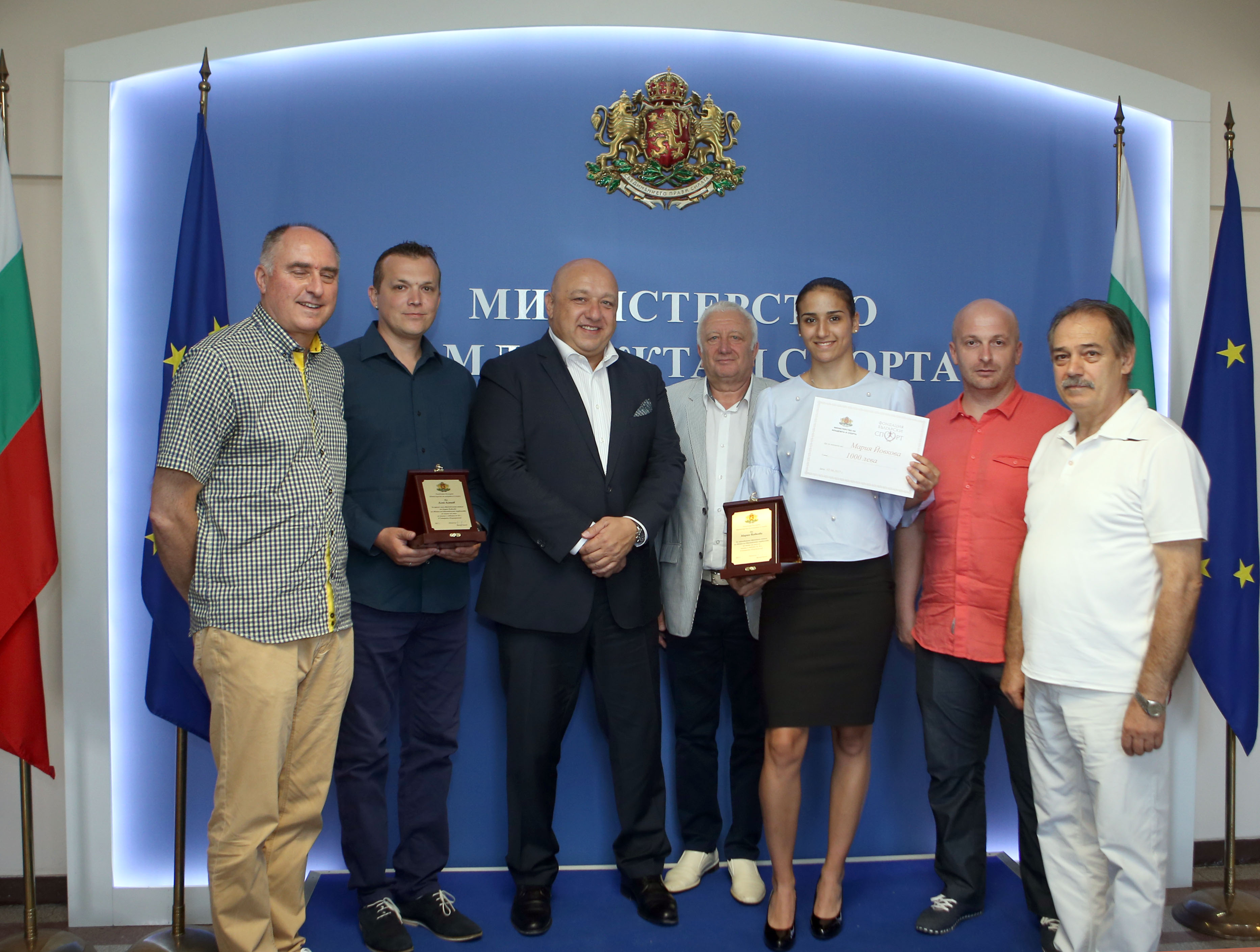 Еврошампионката Мария Йовкова и националният треньор с почетни плакети от министър Кралев