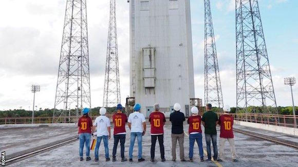 Тази сутрин от космодрума Куру във Френска Гвинея излетя ракетата “Вега”, чийто екипаж качи на борда фланелката с №10 от последния мач на Тоти срещу Дженоа от 38-ия кръг на Серия А, игран на 28 май и завършил с победа 3:2 за Рома.