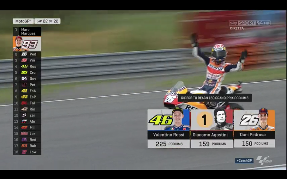 Осем обиколки преди карирания флаг Роси напредна до седма позиция, а Винялес се изтреля на третата, оставяйки зад себе си Кал Кръчлоу и Данило Петручи. Италианецът бе по-лесното препятствие за Доктора и той го изпревари скоро, но Кръчлоу упорито пазеше четвъртото място до последната обиколка, когато не издържа на напрежението и атаките от страна на Доктора. Довициозо също даде най-доброто от себе си в непредвидимото състезание и финишира шести, като остава в топ 4 в генералното класиране.