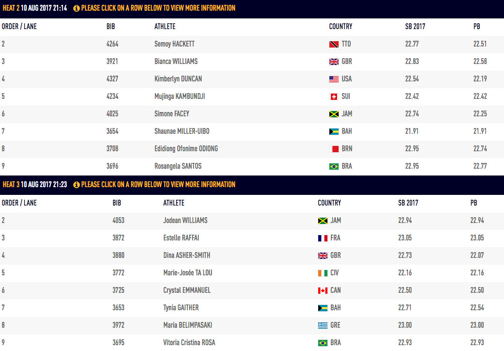 Излишно е да се подчертава присъствието на действащата световна шампионка Дафне Схипърс в серията на Лалова-Колио, тъй като холандката е фаворит номер 1 за златния медал, особено при положение че победителката в спринта на 100 метра Тори Боуи не участва в дисциплината заради контузията, която получи при падането си след пресичане на финалната линия.