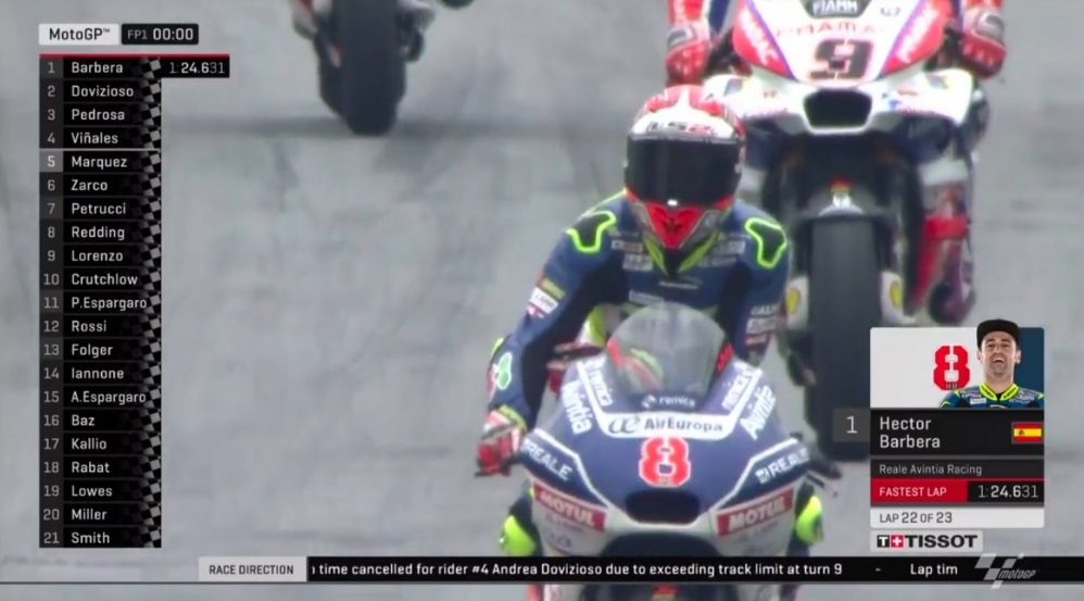 Сателитният пилот на Ducati Ектор Барбера записа най-бързата обиколка в първата свободна тренировка на "Ред Бул Ринг" в MotoGP в заключителните етапи на 45-минутната сесия, след като последната обиколка на Андреа Довициозо бе отменена заради излизане извън очертанията на пистата.