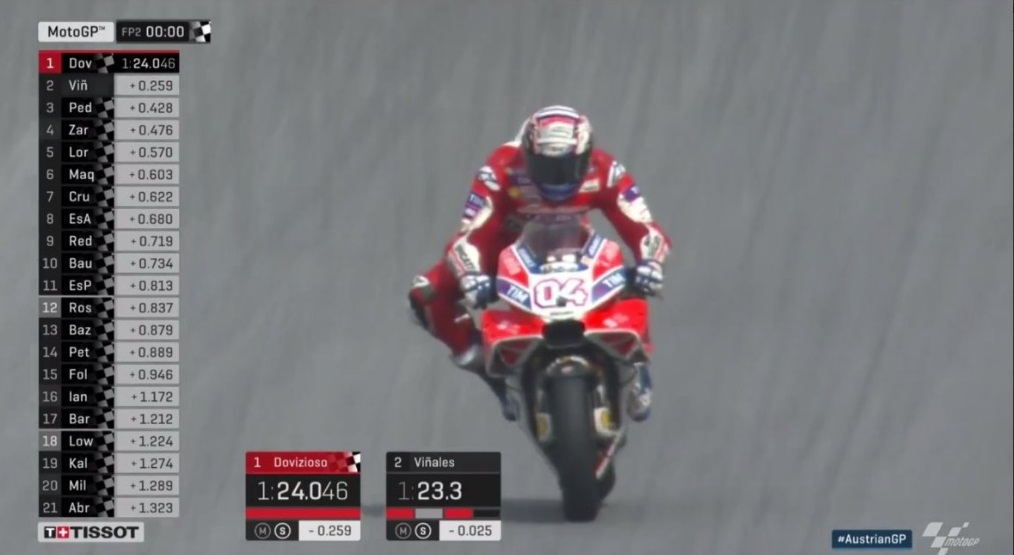 Пилотът на Ducati Андреа Довициозо успя да оглави втората свободна тренировка от състезателния уикенд на Гран При на Австрия в MotoGP, следван веднага от пилота на Yamaha Маверик Винялес и Дани Педроса с Honda.