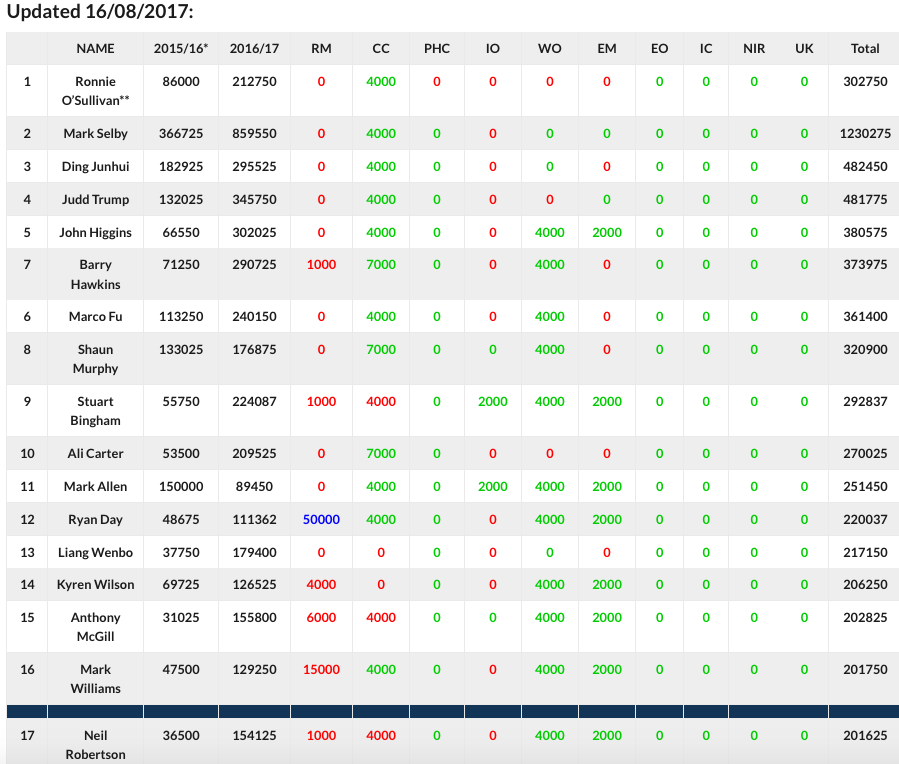 В тази класация засега Робъртсън е на 17-о място и има време до 11 декември да си заслужи поканата за “Мастърс”, защото след края на Шампионата на Обединеното кралство ще бъдат определени окончателните участници. Това подреждане е различно от световната ранглиста именно защото се взимат предвид точките от турнирите между UK Championship 2015 и 2017.