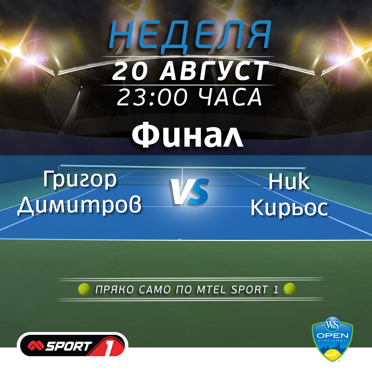 ще излъчи на живо мача за титлата на турнира в Синсинати между Григор Димитров и Ник Кирьос. Първата ни ракета излиза за първия си финал на турнир от сериите ATP Masters 1000, а началото на двубоя е 23:00 часа. Двамата са се срещали само веднъж до момента – на турнира в Индиън Уелс през 2015 г., където Димитров надделя трудно в 3 сета. За да стигне дотук първата ни ракета премина през Фелисиано Лопес, Хуан Мартин дел Потро, Юичи Сугита и Джон Иснър, като срещу последния Димитров измъкна победата след 2 тайбрека – 7:6 (4), 7:6 (10).