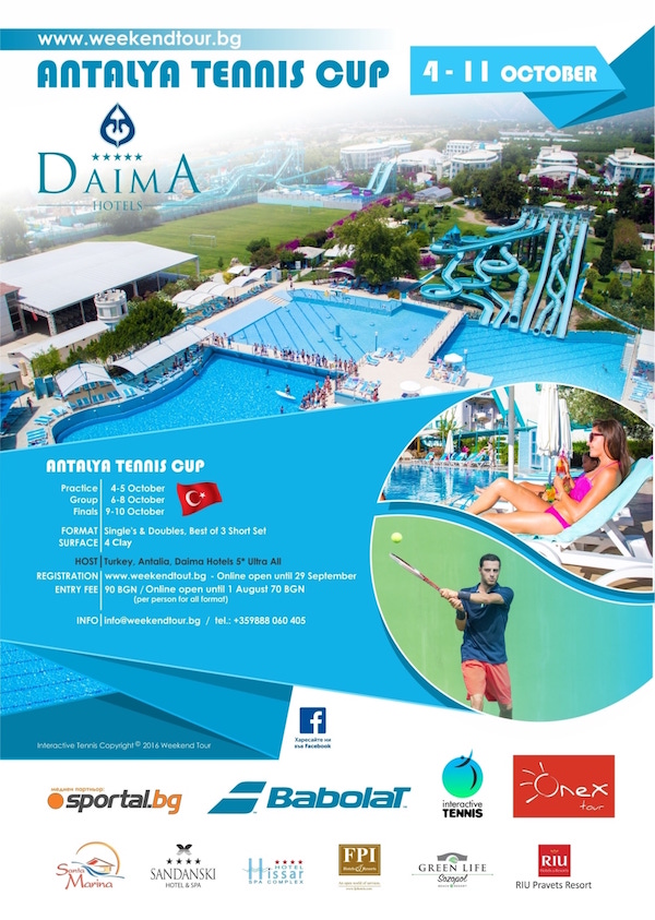 До втората голяма тенис ваканция на Weekend Tour 2017 остава малко повече от месец, а дестинацията не е за изпускане. Надпреварата ще се проведе от 4 до 11 октомври в турския курорт Анталия, като тенисистите и семействата им ще прекарат осем дни в петзвезден лукс и прохлада. Състезателите ще бъдат настанени в хотел „Дайма ризорт“, който се слави с отлично обслужване, вкусна храна и пълно подчинение на прищевките на гостите. Комплексът разполага със собствена 350-метрова плажна ивица с кристална вода и копринен пясък. В непосредствена близост до плажа е безплатният аквапарк с повече от 15 басейна и пързалки. „Дайма ризорт“ предлага неизчерпаеми възможности за релакс – от турска баня, сауна и фитнес до уроци по танци и сърф.