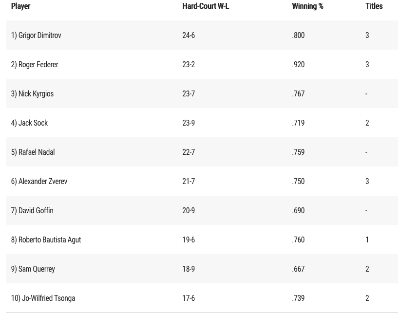 Ето топ 10 на най-добре представящите се играчи на твърди кортове досега през годината (име, съотношение победи-загуби, процент на победите, титли):