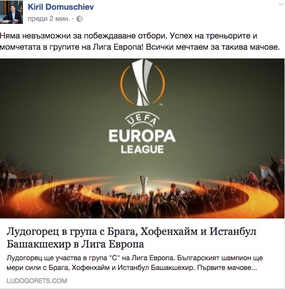 "Няма невъзможни за побеждаване отбори. Успех на треньорите и момчетата в групите на Лига Европа! Всички мечтаем за такива мачове", написа Домусчиев на страницата си във "Фейсбук".