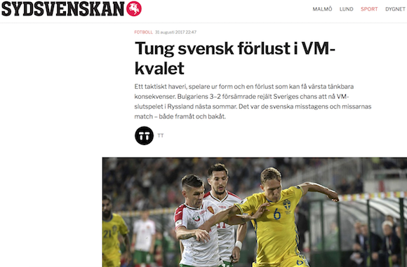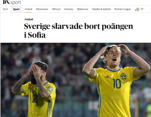 “Швеция се провали срещу България”, пише “DN.sport”, а от “Expressen” допълват: “София не бе мястото за този провал”. “Sydsvenskan” описва поражението в България като “тежко”, “Svenska Dagbladet” и “Helsingborgs Dagblad” излизат със заглавие: “Разочарование в София”, а най-критични и крайни са от “GP”: “Тежка загуба - отписваме първото място”.