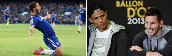 Еден Азар сияе като дете, на което са подарили нови бутонки. Рекламната промоция на новия модел на футболната обувка, която носи от 15-годишен, се превръща в идеалното извинение за даване на интервю, в което фантастичната „десетка” на Челси прави преглед на събитията около себе си. Вече възстановен от счупването на глезена си, което го извади за три месеца от терените (завърна се с в игра с гол за Белгия срещу Гибралтар за 9:0), мечтае да спечели Шампионската лига, облечен в синьо… при все че Реал Мадрид напира много силно за него.