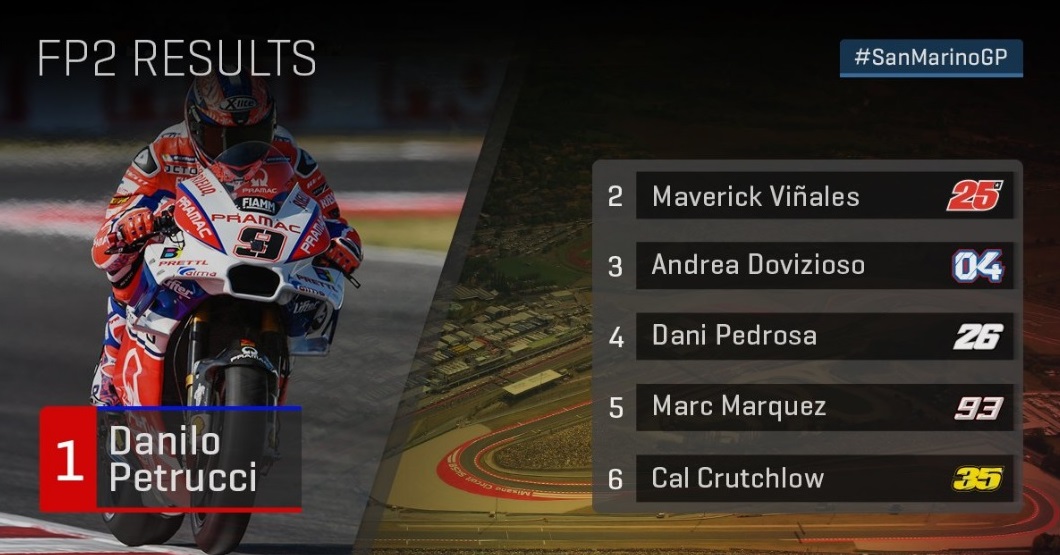Сателитният пилот на Ducati Данило Петручи оглави втората тренировка от състезателния уикенд на MotoGP в Сан Марино, а защитаващият титлата си Марк Маркес падна в последните минути на сесията и не успя да направи последна атака. Така, въпреки че водеше за по-голямата част от тренировката, Маркес остана пети.