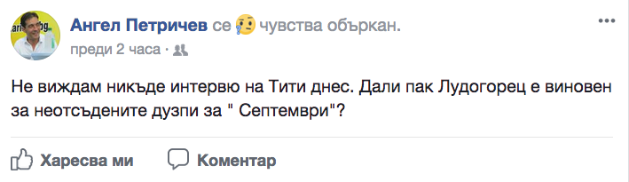 “Не виждам никъде интервю на Тити днес. Дали пак Лудогорец е виновен за неотсъдените дузпи за " Септември”?”