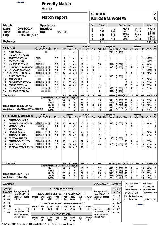 Най-полезни за българския тим бяха капитанката Елица Василева (1 блок, 47% ефективност в атака, 52% позитивно и 35% перфектно посрещане) и Страшимира Симеонова (4 блока, 1 ас и 69% ефективност в атака) с по 16 точки за победата. За сръбкините Бранкица Михайлович (3 аса, 52% ефективност в атака, 33% позитивно и 17% перфектно посрещане) реализира 18 точки.