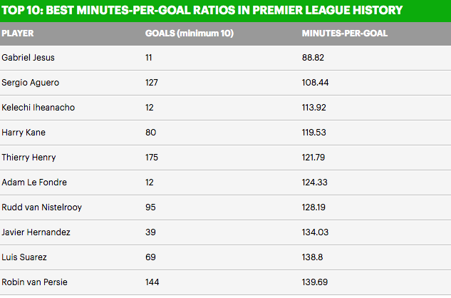 Нападателят на Манчестър Сити Габриел Жезус вече пише история в Премиър лийг, макар и да се присъедини към отбора на Пеп Гуардиола едва през януари. Бразилецът вече има 11 гола, отбелязани за 977 минути във Висшата лига. Това означава, че на него са му нужни средно по 88,82 минути, за да се разпише. По този показател Жезус изпреварва дори своя съотборник Серхио Агуеро, който вкарва средно на всеки 108 минути. Статистиката включва само играчи, които са отбелязали по минимум 10 гола в Премиър лийг.