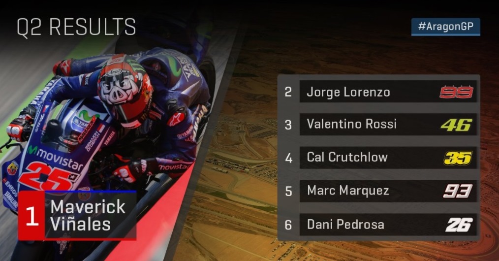 След неуспеха на вчерашната мокра писта "Арагон" при по-добрите условия днес дуото на Yamaha Маверик Винялес и Валентино Роси бяха значително по-конкурентни и бързи. Младият 22-годишен пилот, който се бори за дебютната си титла в кралския клас, записа най-добрата обиколка в квалификацията, а съотборникът му Валентино Роси ще стартира утре от третата позиция. Те двамата бяха разделени от испанецът Хорхе Лоренсо от тима на Ducati.