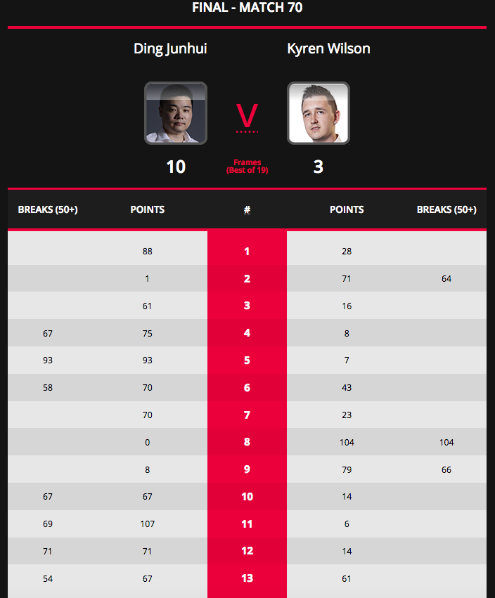 За съжаление на неутралните зрители, този финал също се оказа доста едностранен и бе до голяма степен предрешен още след първата сесия, когато Дин водеше с 6:2. Уилсън, който изобщо не можа да демонстрира каквото и да е прилично ниво, все пак завърши частта с оказалия се единствен сенчъри брейк от 104. След паузата обаче Дин не загуби много време, за да стигне до нужните му четири фрейма със серии 67, 69, 71 и 54.