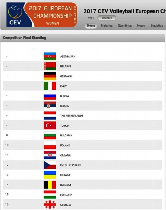 Женският национален отбор по волейбол на България, който е воден от Иван Сеферинов, завърши на девето място в крайното класиране на Европейското първенство в Азербайджан и Грузия Това стана ясно, след изиграване на всички мачове от плейофите във втората фаза на шампионата на Стария континент.
