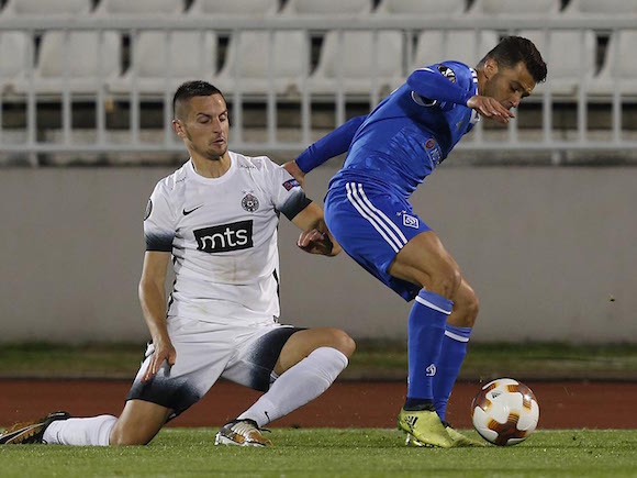 Партизан нанесе своя удар в рамките на 8 минути в края на първото полувреме. В 34-ата Тавамба се разходи в наказателното поле на Динамо и поднесе топката на крака на Ожегович, за когото остана по-лесното. Не след дълго отбраната на украинците отново се пропука и от това се възползва самият Тавамба. Той се квлини между няколко защитници и с шут под гредата преодоля Максим Ковал.