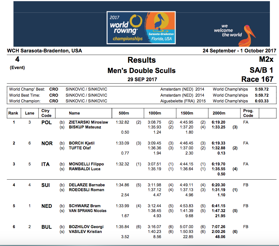Победители в този полуфинал станаха поляците Мирослав Зиетарски и Матеуш Бскуп с време 6:19.33 минути. Второто място остана за двукратният олимпийски шампион на скиф Олаф Туфте и световният шампион на двойка скул от 2013 година Кжетил Борх от Норвегия с резултат 6:19.33 мин. На третото място финишира лодката на Италия Филипо Мондели, Лука Рамбалди с време 6:19.70 минути.