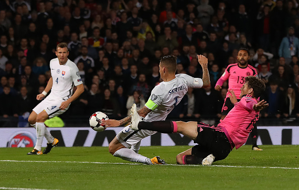 Шотландия излезе на второ място във временното класиране на квалификационна Група F и увеличи значително шансовете си за участие на баражите за Мондиал 2018, след като победи с 1:0 Словакия на "Хемпдън Парк". Близо 70 минути домакините играха с човек повече, но гредите и добрите намеси на Мартин Дубровка ги лишаваха от гола. Той все пак стана факт минута преди края на редовното време, когато Мартин Шкъртел прати топката в собствената си врата. Така Шотландия трябва да победи Словения в неделя, за да си гарантира второто място и участие на баражите.