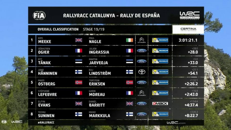 Крис Мийк от тима на Citroen спечели рали Испания – кръг номер 11 от общо 13-те в календара на Световния рали шампионат. Това е втората победа на Мийк за сезона след състезанието в Мексико през април и общо пета в кариерата във WRC. Британецът постигна триумф с 28 секунди преднина спрямо Себастиен Ожие, който се приближи до петата си световна титла в шампионата след оттеглянето на главния му конкурент за световния трофей Тиери Нювил от Hyundai заради повредено окачване.