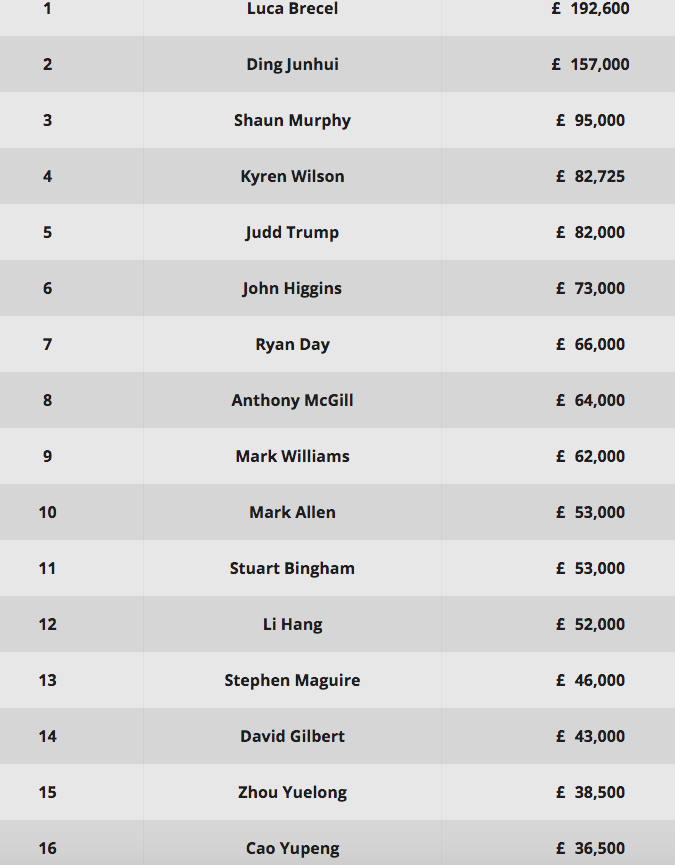 За успеха Тръмп грабна чек за 75 хиляди паунда и вече е на пето място в едногодишната ранглиста с общ актив от наградни фондове до момента през сезона 82 000 паунда. Лидер е Люка Бресел със 192 600, следван от Дин Дзюнхуей със 157 000, Шон Мърфи с 95 000 и Кайрън Уилсън с 82 725. Финалистът от Ломел Бингам грабна чек за 35 хиляди и вече има общо 53 000 на сметката си, които му отреждат 11-а позиция в 12-месечната класация. Прогрес отчита и младият китаец Юлон Жоу, който на Европейския Мастърс стигна до първия полуфинал на ранкинг турнир в кариерата си и от 15-и се изкачи до 19-и. Сънародникът му Юпен Цао постигна абсолютно същото върхово лично постижение и от 28-ми стигна 16-ата позиция.