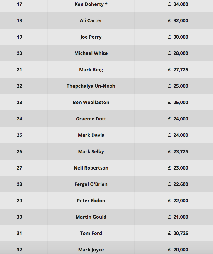 Едногодишната ранглиста се използва, за да отсее топ 32-мата състезатели, които ще участват в Световната Гран при и “Шампионата на играчите” по-късно през кампанията.