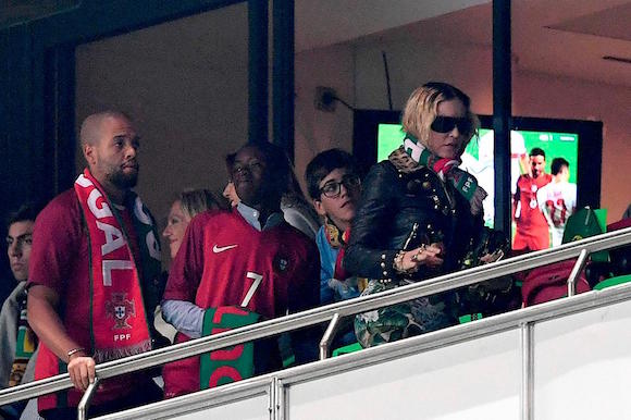 Поп кралицата Мадона изгледа на живо победата на Португалия над Швейцария с 2:0, която класира Кристиано Роналдо и компания за световното първенство през 2018 година в Русия.