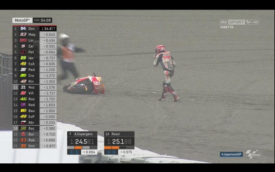 Скоро Маркес успя да скъси съществено изоставането си спрямо италианеца до 0.043 секунди, но веднага след това претърпя катастрофа и сложи преждевременен край на сесията си.