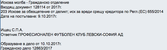 Исковата молба в Софийски градски съд е с дата на постъпване 9 октомври 2017 г., а делото е образувано на следващия ден.