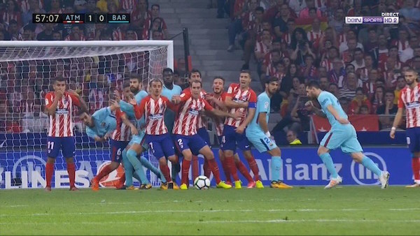 Аржентинската суперзвезда Лионел Меси не успя да порази вратата на Атлетико Мадрид при равенството (1:1) на “дюшекчиите” с Барселона в мача между двата тима в испанската столица през изминалия уикенд, но когато “десетката” на “лос кулес” е на терена противниковите футболисти трудно могат да бъдат спокойни. При резултат 1:0 за мадридчани Меси имаше възможност да изравни резултата с изстрел от фаул, а както знаем, аржентинецът е майстор и не преките свободни удари. Опитът на Меси в този случай не бе успешен, но израженията на лицата на застаналите на стената футболисти на Атлетико казват всичко.