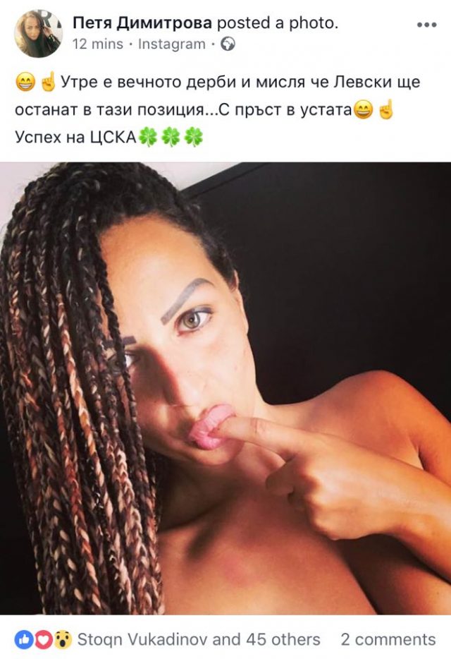 “Утре е вечното дерби и мисля, че Левски ще останат в тази позиция.. с пръст в уста. Успех на ЦСКА”, написа брюнетката.