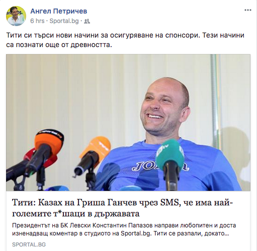 Изпълнителният директор на Лудогорец Ангел Петричев отговори на нападките на Константин Папазов, които президентът на БК Левски направи преди дербито между Левски и ЦСКА-София. На своята стена във "Фейсбук" шефът на шампионите написа: "Тити търси нови начини за осигуряване на спонсори. Тези начини са познати още от древността".