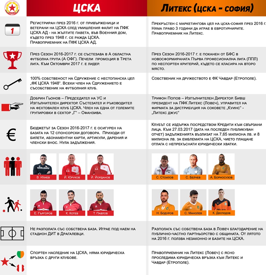 Третодивизионният клуб е направил сравнителен анализ на двете дружества, като в него се твърди, че ЦСКА-София продължава да е собственик на базата в Ловеч благодарение на публично-частно партньорство с местната община.
